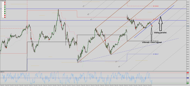Vanmiddag waren we al even buiten de pitchfork geweest maar de koers veerde al snel weer op, in dat geval mag je een sliding parallel tekenen dit is een lijn evenwijdig aan de pitchfork, komt de koers hier later weer onder dan is dit een short signaal en dat is later gebeurd, het doel is de Median Line van de oranje pitchfork, ik trail de positie aan de hand van de ATR is de rode lijn boven de koers.