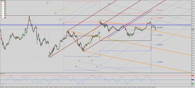 De AEX verloopt wat zijwaarts sinds gister we komen nog niet echt hoger of lager, mochten we straks onder het laagte punt van vanmorgen zakken dan is 504 mijn eerste doel de ML van de pitchfork.