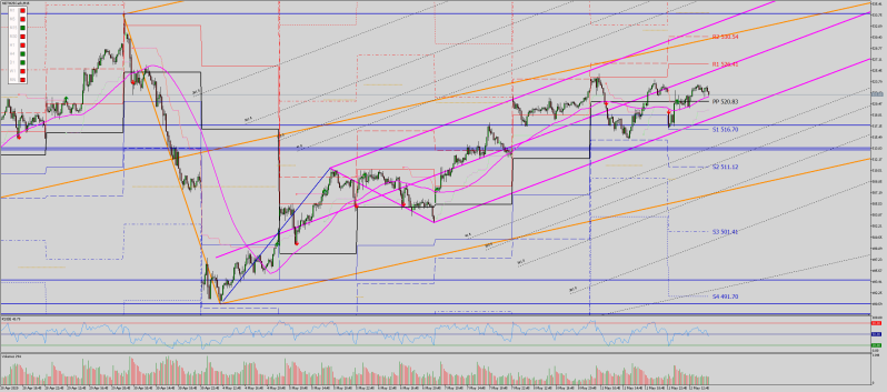 Gister brak de koers door de pitchfork omlaag en dit gaf een short signaal, deze bracht maximaal 1.5 R op en is bij mij op break even gestopt, helaas zette de daling niet door en staan we vandaag weer tegen de top aan, de koers gaat nu dus wat zijwaarts en dan mogen we een schiff pitchfork tekenen, nu is het opletten stijgen we door dan is de bovenkant een short zone of als we weer uitbreken onderaan, nu doe ik even niks omdat we in het midden zitten.
