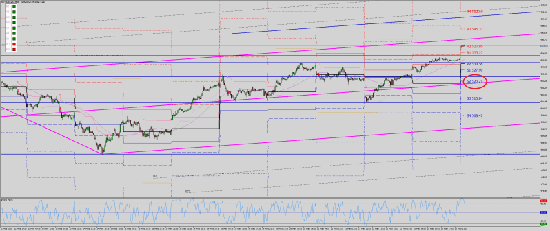 De AEX is vandaag aangekomen bij de bovenkant van de pitchfork rond 538 dit is een weerstand, zo lang we daar onder blijven is er een kans dat we de ML lijn weer gaan opzoeken rond 523, breken we met kracht uit boven de pitchfork dan is dit scenario van tafel.
