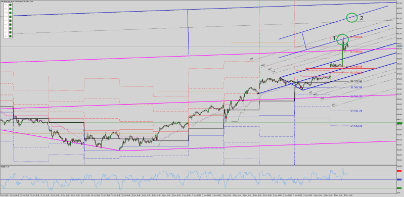 DE AEX is vanmiddag met enorm veel kracht uitgebroken door goed nieuws over het vaccin, hoe nu verder, ik heb de oude pitchfork en warning lines verwijderd omdat dit patroon tot zijn eind gekomen was, de blauwe pitchfork was uitgebroken en is nu tot de eerste warning line gekomen, nu opletten of we door de bovenste lijn gaan dan is lijn 2 het doel rond 610, komen we onder de 580 (rode lijn) dan kunnen we weer de lagere zones gaan opzoeken.