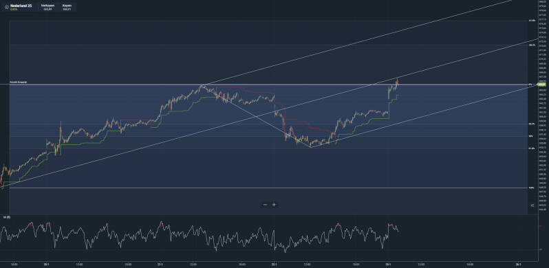 De AEX zit al even in en mooie opwaartse beweging vandaag met een gapje omhoog precies tot aan de ML van de pitchfork, als we er doorgaan kunnen we naar de 675 punten.