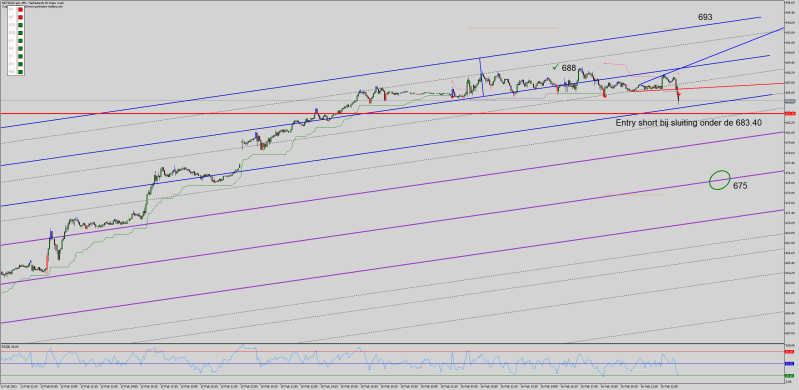 17:05: We zijn gesloten onder de 683,40 dus de entry short is getriggerd, ik heb de stop-loss en eerste target aangegeven.