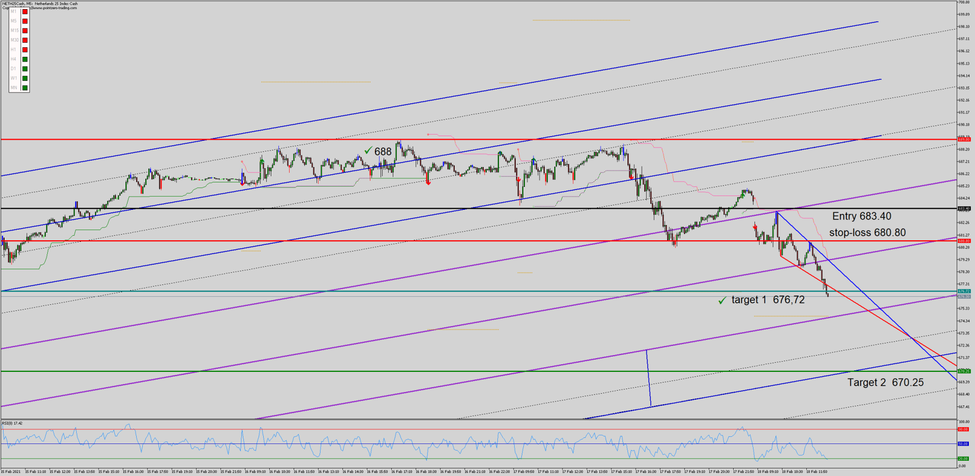 09:15 De AEX is gister onder de 683.40 gekomen, zo lang we onder de 689 blijven is het eerste target het doel zo rond 676.72.