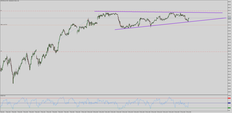 09:30: We zijn gister uit de oranje pitchfork gebroken en hangen nog steeds onder de stop-loss, ben erg benieuwd hoe het verder gaat, gaan we door de weerstand heen dat is tevens de stop-loss dan wil de markt waarschijnlijk hoger en is mijn eerste richtpunt de 700 punten.