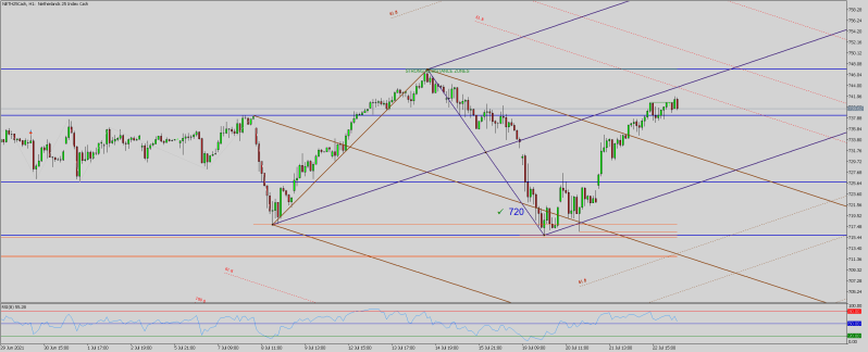 De AEX 741 is behaald, we zitten rond de ML lijn dit is altijd een punt waar de koers waarschijnlijk een stukje terug kan. Zal de 746-747 er nog in zitten binnen kort?