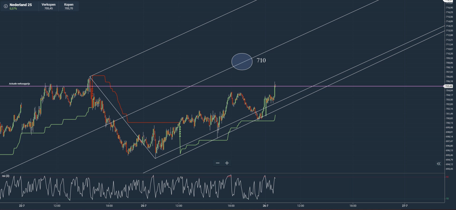 De AEX heeft steun gevonden aan de onderkant van de pitchfork, nu kijken of we 710 kunnen gaan behalen en daarna de median line van de pitchfork. De opgaande beweging blijft geldig zo lang we niet uitbreken aan de onderzijde.